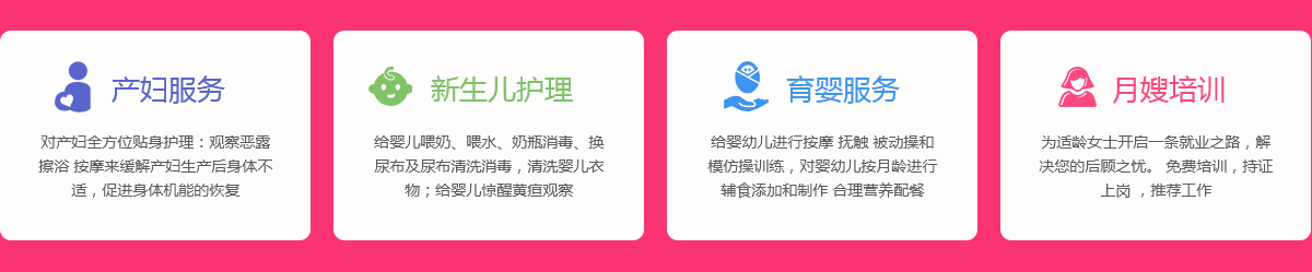 關(guān)于我們 產(chǎn)婦服務(wù) 新生兒護(hù)理 育嬰服務(wù) 月嫂培訓(xùn) 催乳師培訓(xùn) 舒心家政 月子餐 資質(zhì)榮譽(yù) 服務(wù)案例