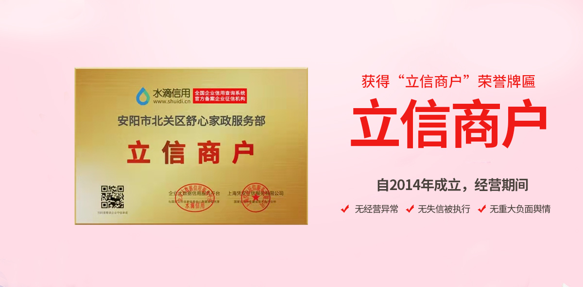 安陽(yáng)市北關(guān)區(qū)舒心家政服務(wù)部立于2014年 是經(jīng)工商管理部門注冊(cè),具有母嬰護(hù)理服務(wù)機(jī)構(gòu) 所有上崗人員均通過(guò)崗位技能培訓(xùn)嚴(yán)格考核,持有身份證 健康證 母嬰護(hù)理師證并且在公安部門備案方可上崗。安陽(yáng)市北關(guān)區(qū)舒心家政服務(wù)部針對(duì)產(chǎn)婦和新生兒的特殊護(hù)理要求制訂一整套的護(hù)理方法 在現(xiàn)代科學(xué)理念的指導(dǎo)下通過(guò)對(duì)產(chǎn)婦的飲<了解更多>